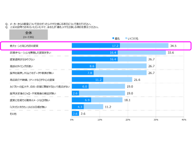 ▼メーカーからの提案について「イヤだ」と感じる内容:1位:「他チェーンと同じ内容の提案」 34.5%