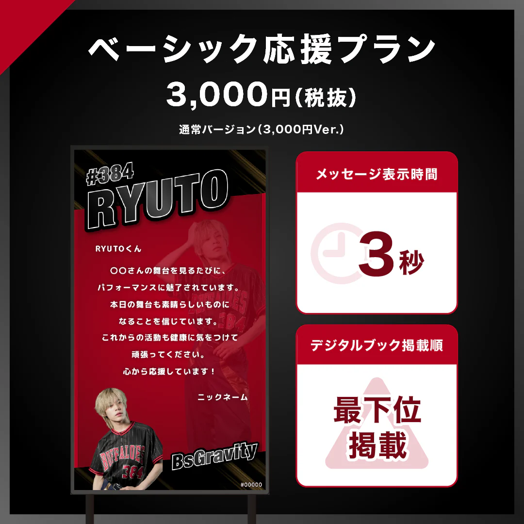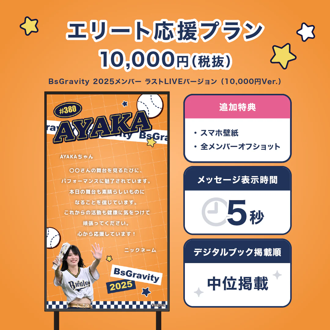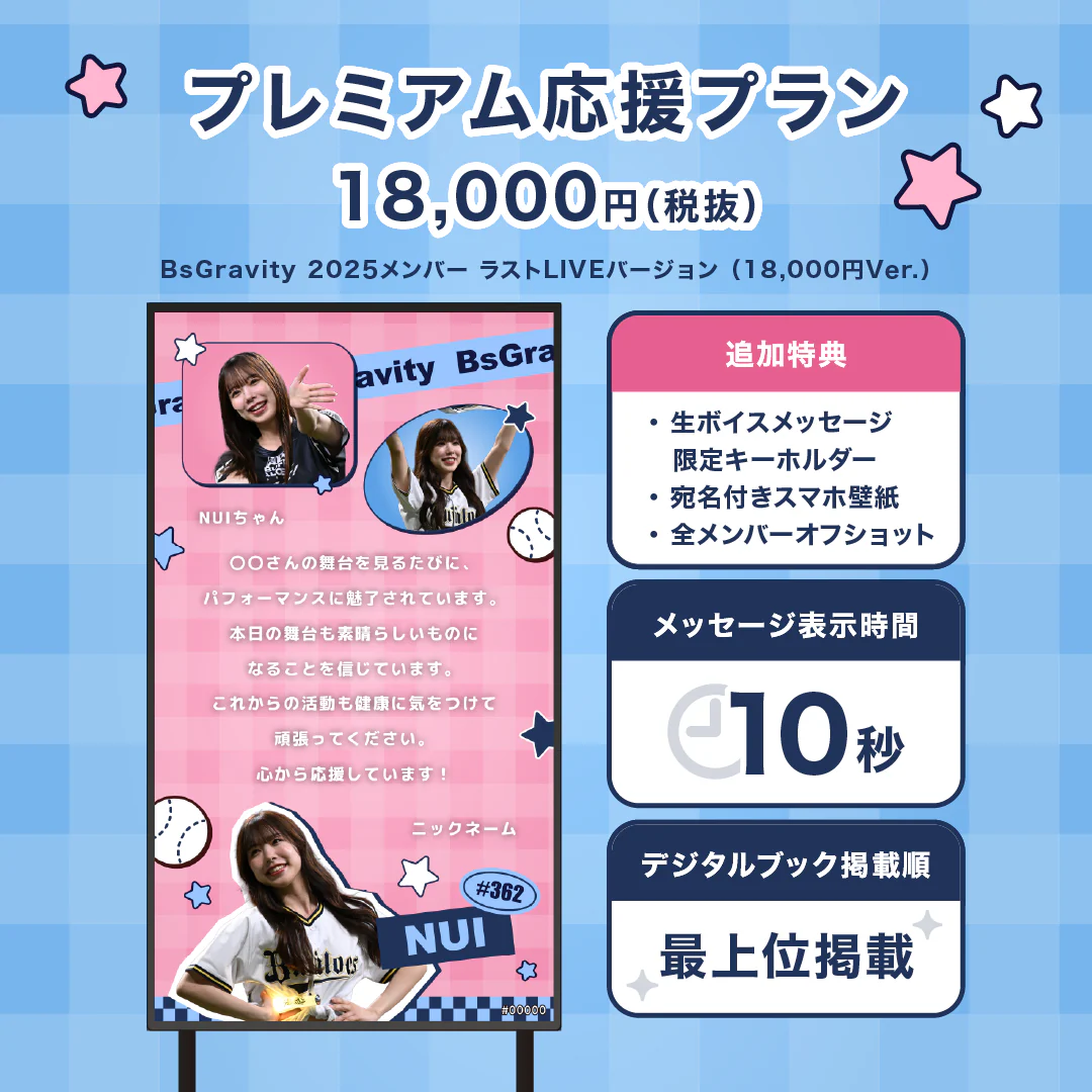 今回は、オリックス・バファローズ公式ダンス&ヴォーカルユニット「BsGravity」向けにあなたのスマホから推しへ応援メッセージギフトを贈ることができます。