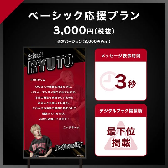「【BsGravity2025 FINAL LIVE】BsGravityに#推しメッセ(R)︎を贈ろう!」は、以下の6つのプランからお選びいただけます。