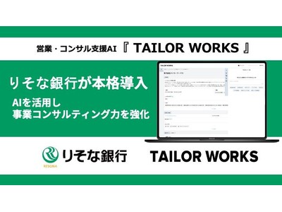 株式会社テイラーワークス(東京都渋谷区、代表取締役CEO:難波弘匡、以下当社)は、2025年12月10日、株式会社りそな銀行が、当社提供の営業・コンサル支援AI「TAILOR WORKS」を本格導入したことをお知らせします。今回の導入により、りそな銀行の法人向け事業コンサルティングの効率化・高度化を組織的に推進していくと共に、AIを活用した地域金融機関の事業コンサルティングのロールモデルを構築していきます。