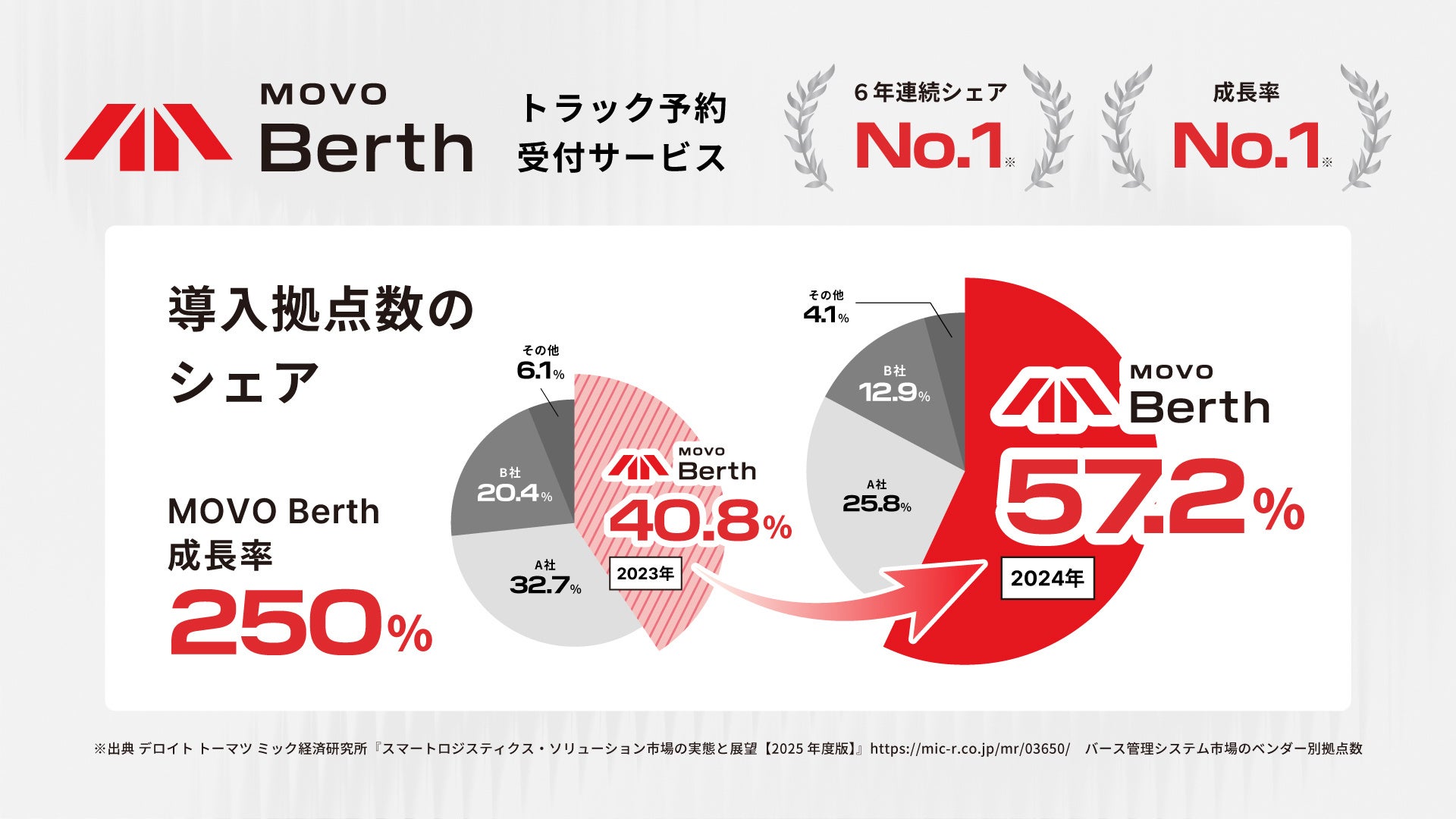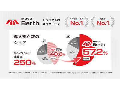 MOVO Berth」が、2024年度のバース管理システム市場(※1)の導入拠点数シェア57.2%となり、同市場で6年連続No.1(※2)を記録したことをお知らせします。また2024年度の拠点数ベースの成長率は、前年度比250%となり、同市場で最も高い成長率となりました。