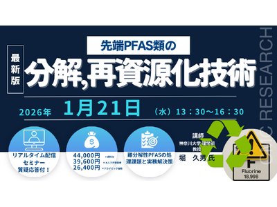 ★PFAS規制が加速する中、産業用PFAS類の分解・再資源化は待ったなし。本セミナーでは超臨界水分解を中心に、最新の技術動向と代替材料の実用化状況まで。リスクと対策を体系的に整理