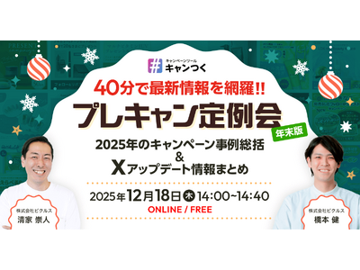 SNSキャンペーンツール「キャンつく」を提供する株式会社ピクルス(以下、ピクルス)は、2025年のSNSキャンペーン事例とX(旧Twitter)の最新アップデート情報を総括するウェビナー「プレキャン定例会」を2025年12月18日(木)にオンライン開催いたします。