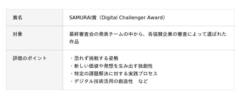 SAMURAI賞は、皆さんの「恐れず、一歩踏み出す」挑戦と突破の精神を評価します。既存の仕組みや常識に対し、デジタル技術で切り込み、解決を試みたみなさんのアイデアを楽しみにしています。