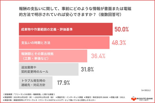 不安なく働くために事前に明示してほしい情報として最も多かったのは、「成果物・作業範囲の定義・評価基準」(50.0%)でした。次いで「支払いの時期と方法」(48.3%)、「報酬額とその算出根拠(工数・単価など)」(36.4%)が続き、“何に対して、いつ、どれだけ支払われるのか”という条件の可視化が求められていることが明らかになりました。また、「追加業務・契約変更時のルール」(31.8%)や「トラブル発生時の連絡先・対応方針」(17.9%)も上位に入り、契約運用の透明性が安心感に直結していることがわかります。
