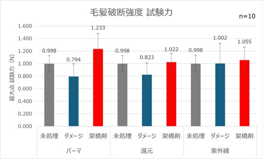 ラサーナを展開する株式会社ヤマサキとクローダジャパン株式会社は、パーマ処理・紫外線照射・還元処理などによって低下した毛髪破断強度が、架橋剤の処理によって上昇することを実証しました。毛髪内部の切断されたシスチン結合を再架橋し、健常毛レベルまで強度を回復できることを確認したこの成果は、ラサーナが長年積み重ねてきた研究と技術開発によって初めて実現したものです。