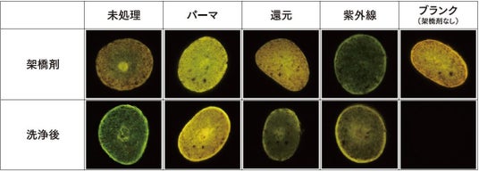 これまで、パーマや紫外線などによる毛髪内部のシスチン結合の切断ダメージは、「修復が困難」とされ、業界でも長年の課題でした。しかし、最新の研究により、架橋剤「ジマレイン酸プロピレンジアンモニウム」(※3)がダメージを受けた毛髪内部に浸透し、切断されたシスチン結合を再架橋できることが明らかになりました。この成分は、毛髪内部にしっかり浸透し、ラウリル硫酸ナトリウム水溶液(※4)で洗浄した後も髪内部に留まることが確認されています。