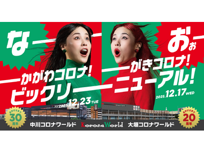 株式会社コロナワールド(本社:愛知県小牧市、代表取締役社長:室橋 義隆)が運営する複合アミューズメント施設「大垣コロナワールド(岐阜県大垣市)」および「中川コロナワールド(愛知県名古屋市中川区)」は、それぞれ開業30周年・20周年を迎える節目に合わせて全面改装を行い、2025年12月17日(水)・12月23日(火)にリニューアルオープンいたします。