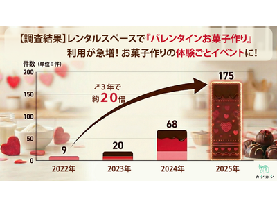 レンタルスペースのマッチングプラットフォーム「カシカシ」を運営する株式会社友安製作所(本社:大阪府八尾市、代表取締役社長:友安啓則)は、2026年のバレンタインデーに向けたスペース利用動向を発表いたします。 近年、バレンタインにおけるお菓子作りは、ただ食べるだけでなく「作る体験そのものを楽しむ」イベントへと進化しています。当社のデータによると、お菓子作りを目的としたレンタルスペースの利用件数は、2022年と比較して約20倍に急伸いたしました。 自宅では扱えない本格的な器具の利用や、パートナーとの共同作業、SNS映えする空間での撮影など、多様化する「令和のバレンタイン」の実態をご報告します。