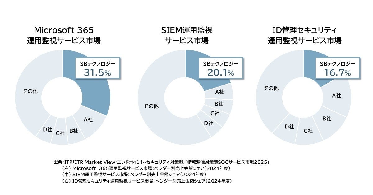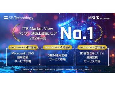 SBテクノロジー株式会社(本社:東京都新宿区、代表取締役社長 CEO:阿多 親市、以下 SBT)は、株式会社アイ・ティ・アール(以下 ITR)が2025年11月13日に発行した「ITR Market View:エンドポイント・セキュリティ対策型/情報漏洩対策型SOCサービス市場2025」のレポートにおいて、「Microsoft 365運用監視サービス市場」、「SIEM運用監視サービス市場」、「ID管理セキュリティ運用監視サービス市場」の3つの市場で2024年度ベンダー別売上金額シェア1位を獲得しました。