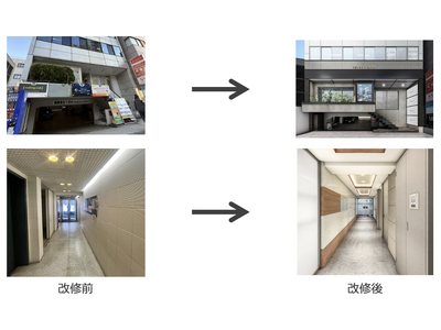 「白金台」の持つ文化的で重厚な街並みに調和しつつ、学習塾やクリニックなどクリーンな印象を求める入居者にも寄り添う軽やかなデザインへ刷新。低層部のゲート形状アプローチと特徴的な軒天を活かし、ゲートらしさを強調した端正なファサードとしたうえで、看板位置を整理しデジタルサイネージを導入することで視認性と更新性を高めました。また宅配ボックスの新設やEVホール天井の折り上げ・間接照明により、機能性と快適性を両立し、建物の価値を現代的にアップデートしました。