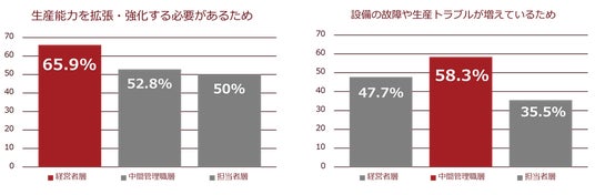 さらに、設備更新の社内優先度が高まる背景を役職層別に確認すると、経営層の65.9%が「生産能力の拡張・強化」を重視しているのに対し、中間管理職層は52.8%と、13.1ポイントの乖離があることがわかりました。一方で「設備の故障・生産トラブル増」への課題意識は中間管理職層が58.3%と最も高く、経営層は47.7%、担当者層では35.5%にとどまり、役職間で認識に大きな幅があることがわかりました。