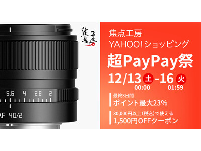 焦点工房Yahoo!ショッピング店は、「超PayPay祭」最終3日間に「ポイント最大23%還元」を実施します。また期間中は、「税込30,000円以上のご購入で使える1,500円OFFクーポン」などの特典をご用意。Yahoo!ショッピングにて、焦点工房の取り扱うレンズやマウントアダプター、アクセサリーをお得に手に入れる期間となります。