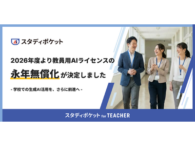 スタディポケット株式会社(本社:東京都千代田区、代表取締役:山地瞭/鶴田浩之)は、同社が提供する教育支援AIプラットフォーム「スタディポケット for TEACHER」のライセンス利用料を、2026年度(2026年4月1日~)のご契約以降、全国の学校教育機関に対して、期限の定めなく無償化することを発表いたします。
