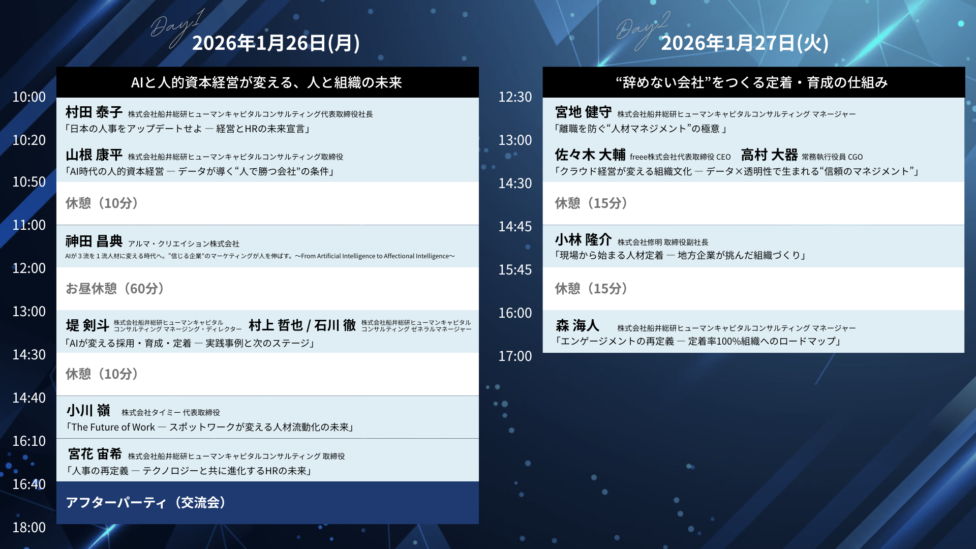 彼らが提示するのは、人的資本経営の核心に迫る「6つの論点」と、机上の空論ではない「実証済みの成功モデル」です。各社の現場で培われた高度な知見とノウハウを体系的に共有する本講演は、自社の戦略を具体化するための極めて実践的な機会となります。