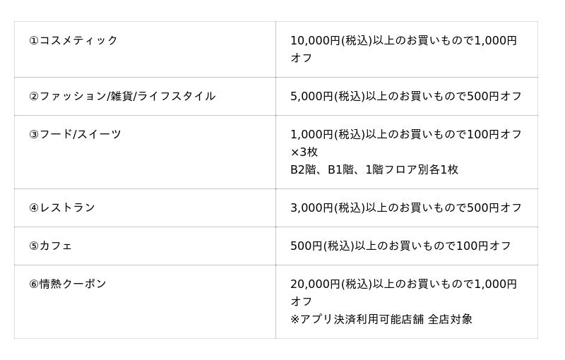 期間中、ファッション、雑貨、フードなど約50ショップでセール・福袋を展開します。また、コスメなど通常セールにならない商品もお得に購入可能な「PARTY COUPON」最大3,400円分をプレゼント。さらに、対象クーポンを3枚以上ご利用いただいた方から抽選で100名さまに、2,026ポイントのお年玉ポイント*をプレゼントします。