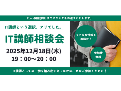 株式会社MCEAホールディングス(東京都港区/代表取締役社長 齋藤 武育)のグループ会社で、 ITエンジニアの新しい働き方を提案する株式会社PE-BANK(東京都港区/代表取締役社長 高田 幹也)は、ITエンジニアのキャリアの一つである「IT講師」という働き方をテーマにしたオンライン相談会「IT講師という選択、アリでした。」を2025年12月18日(木)19時より開催します。本イベントでは、IT講師のキャリアに関心を持つフリーランスや独立希望者を対象に、現役講師や教育事業担当者が仕事内容や報酬、働き方の実態を紹介し、個別相談の機会も提供します。