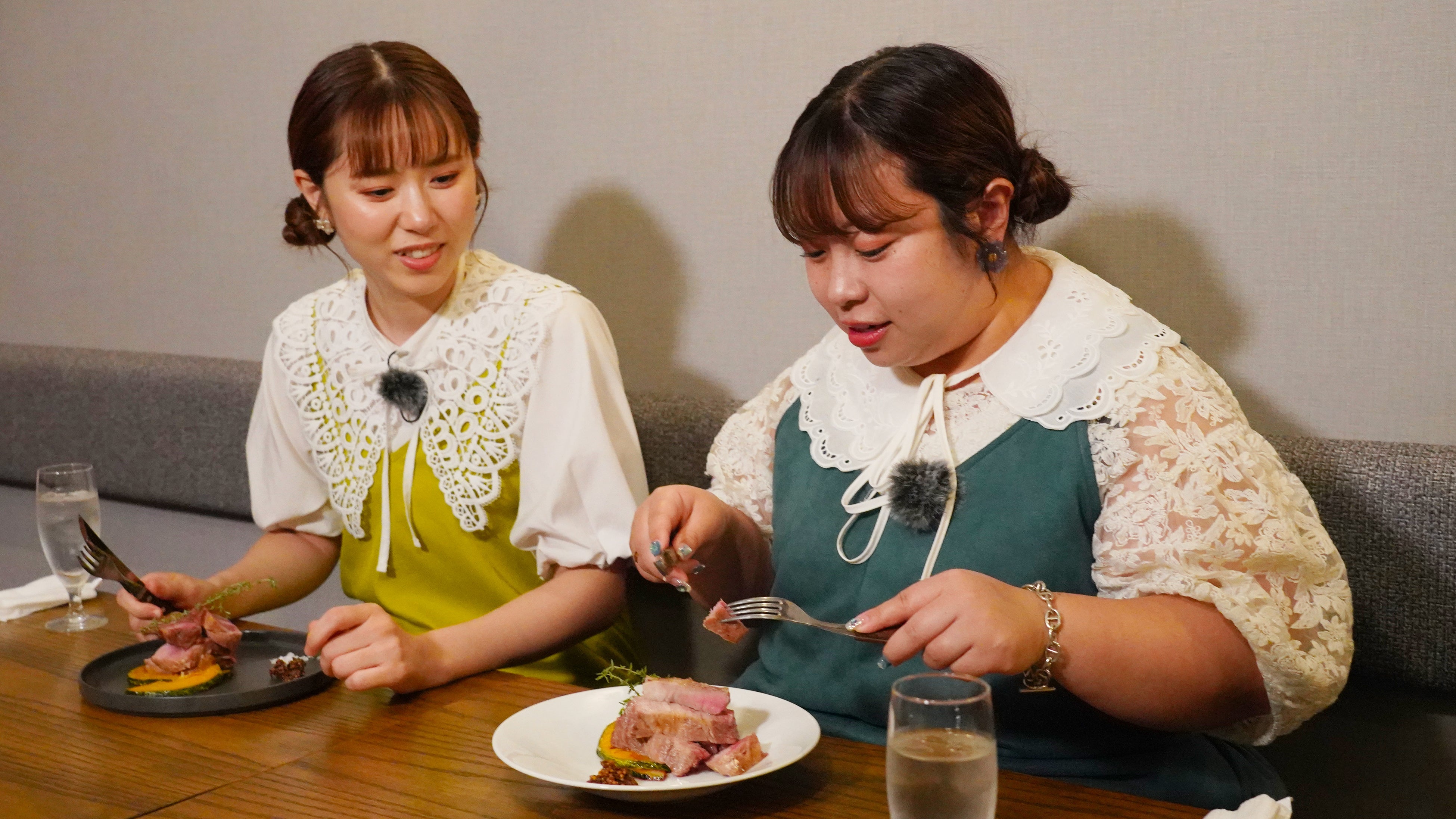 「愛媛甘とろ豚」は全国的にも珍しい「中ヨークシャー種」をお父さんにもつ豚です。一般的な豚肉よりも脂の融点が低いため、「36℃の口どけ」のキャッチフレーズのとおり牛肉にも負けないジューシーなお肉となっています。お二人は初めて食べられるとのことで、その口溶けの良さを十二分に味わっていただきました。県内スーパ―での取り扱いも増えており、県民の皆様にも親しみのあるお肉となっています。これまで、「愛媛食べ尽くし女子旅」でご紹介いただいた「媛っこ地鶏」と「愛媛あかね和牛」、そして「愛媛甘とろ豚」を味わいに、愛媛県で食べ尽くし旅をしてみてはいかがでしょうか。