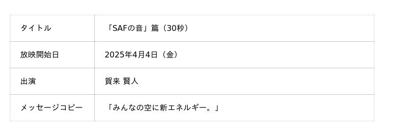 当社は2025年4月から、賀来賢人さんが出演するテレビCM「SAFの音」篇の放映を開始。コスモエネルギーグループが国内で初めて量産化を実現したSAFについて、使用済み食用油からSAFが作られることを「みんなの空に新エネルギー。」のメッセージと共に伝え、消費者の皆さまに広く知っていただくことをめざしました。今回の受賞は、こうした当社のCM展開が高く評価されたものです。