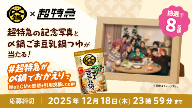 WebCMの公開を記念して、「〆鍋を楽しむ超特急の記念写真&〆鍋 ごま豆乳鍋つゆセット」が抽選で8名様に当たる、プレゼントキャンペーンを実施いたします。