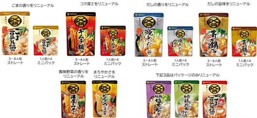 ごま豆乳鍋つゆ・キムチ鍋つゆ・焼あごだし鍋つゆ・寄せ鍋つゆ(ストレート・ミニパックともに)、濃厚みそ鍋つゆ、