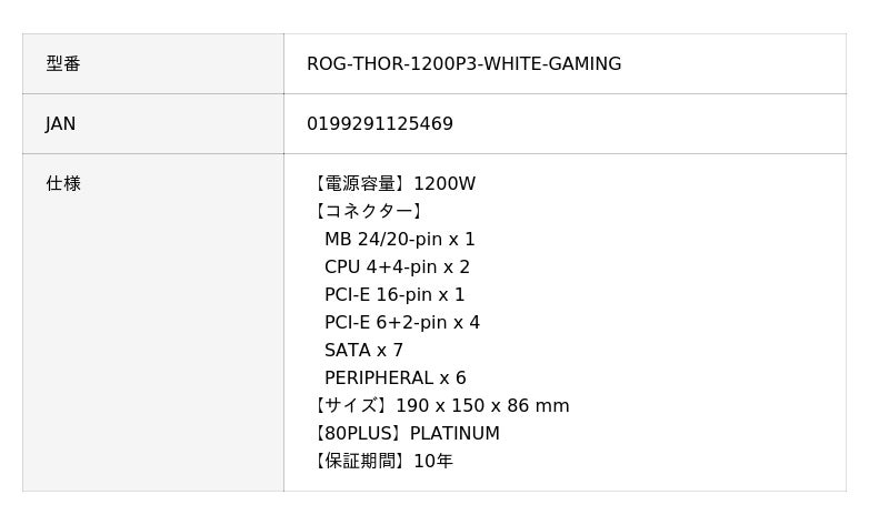 ROG-THOR-1200P3-WHITE-GAMING | ASUS (エイスース) 80PLUS PLATINUM ATX電源