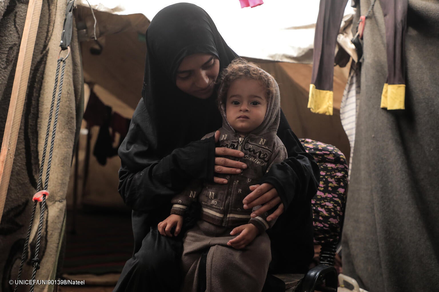 仮設テントで寝起きをする親子。ガザ地区の子どもたちは栄養不良と感染症のリスクにさらされている(パレスチナ、2025年11月14日撮影) (C) UNICEF/UNI901398/Nateel