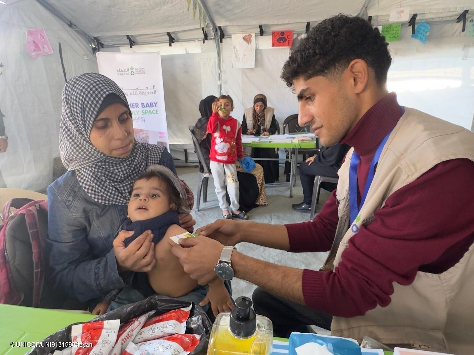 ユニセフが支援する栄養治療拠点で、上腕計測メジャーを使った検査を受ける1歳のモアタズちゃん。急性栄養不良と診断されていたが、8週間の治療を経て回復しつつある(パレスチナ、2025年12月2日撮影) (C) UNICEF/UNI913159/Eleyan