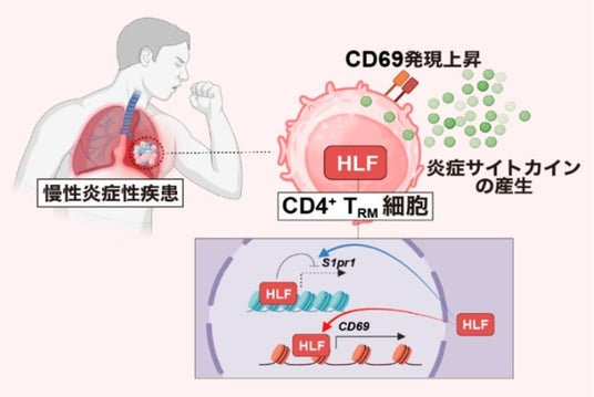 本研究では、転写因子HLFが、炎症反応を担う免疫細胞である炎症性CD4⁺TRM細胞を特定の組織に定着させる司令塔として機能することを初めて解明しました。