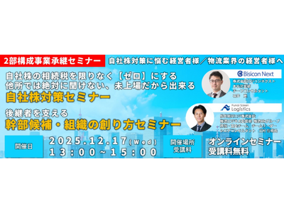 2025年12月17日(水)に開催されるオンラインセミナー『事業承継セミナー(自社株対策および幹部候補・組織の作り方)』にて、船井総研ロジ 物流HRグループ 評価・賃金チーム チームリーダー シニアアソシエイト 三村 信明 が講演します。
