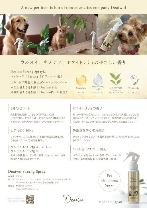“Skincare research, Now for your beloved Pets”人の美容研究をヒントに、Deaiwoが届ける“ラグジュアリーグルーミングスプレー”を日々の上質ケアに