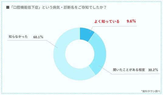 一方、「口腔機能低下症という病気・診断名をご存知でしたか?」という質問では、「よく知っている」と答えた人は9.6%、「聞いたことがある程度」と答えた人は30.2%にとどまり、認知率は約40%という結果になりました。誤嚥性肺炎の認知度は高いものの、その主な原因の一つである口腔機能低下症については認知が十分に進んでいない現状が明らかになりました。