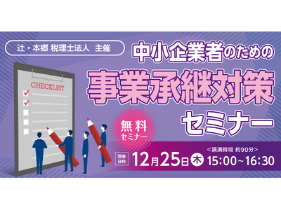 辻・本郷 税理士法人(本社:東京都新宿区、理事長:桑木小恵子)は、2025年12月25日に「中小企業者のための事業承継対策セミナー」を開催いたします。(会場:萩・明倫学舎 本館 復元教室)中小企業の経営において、事業承継は避けて通れない重要なテーマです。