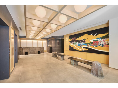 1階ロビーは、浅草の「今と昔」を重ね合わせた「OZ-尾頭-山口佳祐氏」の絵画を中心に構成。天井には浅草の灯り文化から着想した提灯格子を施し、柔らかい光でお客様をお迎えします。絵画前のベンチには、浅草の歴史的な建築にも用いられてきた神奈川県真鶴町産の小松石と、座面には黒皮風に仕上げた鋼材を採用。床はモルタル風タイルで仕上げました。木材と和紙、石と鉄といった異素材の対比によって、ほどよい陰影とエッジを加えています。