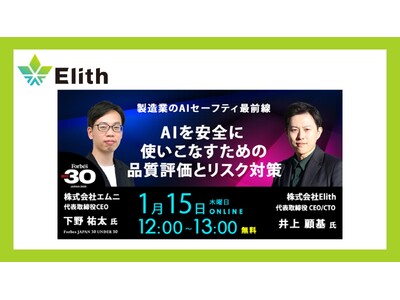 株式会社Elithは、株式会社エムニと共催し、製造業におけるAIセーフティの最新動向を解説するオンラインウェビナー「製造業のAIセーフティ最前線 AIを安全に使いこなすための品質評価とリスク対策」を開催いたします。