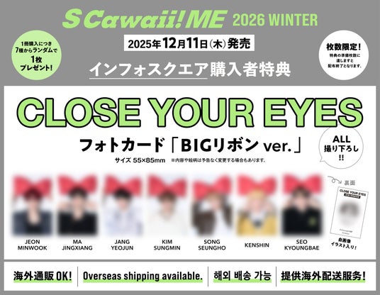 『S Cawaii! ME 2025 SPRING』(2025年4月発売)の誌面が大好評だったCLOSE YOUR EYES(クローズ ユア アイズ)が熱いアンコールにお応えし、再び登場! 前回の記事はPDFでご覧になっていたというメンバーの皆さん。本をはじめて見て、「うわー! 僕たちが載ってる!」と大興奮! オーディション出身者が多いだけに、エスカワのバックナンバーを見ながら「あ! 友達が載ってます!」とうれしそうなメンバーも。今回も私物紹介や「モテモテ(ハート)エピソード」「メンバーのかわいいところ、カッコいいところ」など、たくさんのインタビューに答えてくださいました。11月に韓国で3rd ミニアルバムがリリースされ、来年2月には東京・名古屋・大阪をめぐる初の単独ツアーも決定、ますます人気が高まっているクルユアをぜひチェックしてくださいね! 21名様にサイン入りチェキプレゼントもありますので、お楽しみに!