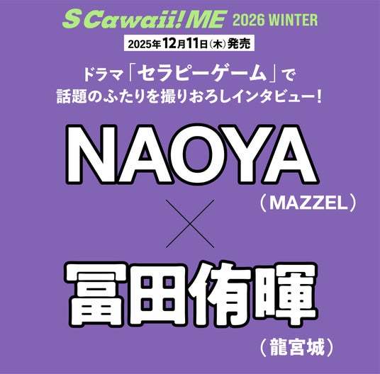 大きな話題となった前作から早一年、2026年1月からスタートするドラマ『コスメティック・プレイラバー Season2』で“とよそう”が戻ってきます! 奥野さんに登場いただいた『S Cawaii! メンズ特集第3弾』 (2021年7月発売)をおふたりにお見せしたところ、「ヤバい! 幼い!(笑)」と爆笑する奥野さん。そんな奥野さんの顔をまじまじと見ながら、「ますますカッコよくなったね……」とつぶやく豊田さん。まさにドラマさながらの仲の良さでした。インタビューでは「自分の好きなところ」「あなたに恋をしたらどんな良いことがありますか?」「モテモテ(ハート)エピソード」「ふたりだけが知っているお互いの秘密や気づいたところ」などの質問にユーモアを交えながら答えてくださったり、「お互いへのメッセージをお願いします」という質問では心が温まるコメントも。『S Cawaii! ME』オリジナルの衣裳に身を包み、息の合ったポージングを披露してくださったW王子をぜひご堪能下さい! 6名様にサイン入りチェキプレゼントもありますので、ご応募お待ちしております。
