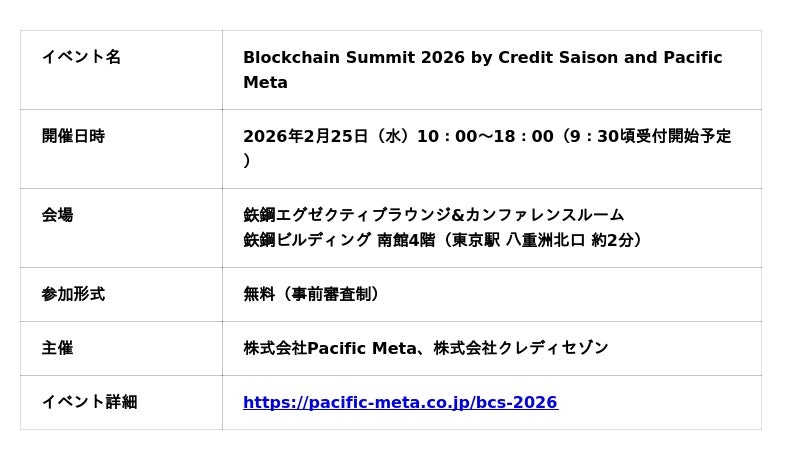 「Blockchain Summit 2026 by Credit Saison and Pacific Meta」を開催いたします。