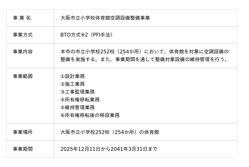 本事業は、熱中症予防対策の一環として、大阪市が小学校の体育館への空調設備の整備を進めるものです。PFI手法※1を導入することで、民間事業者の技術的知見・能力などを最大限に活用して短期間で空調設備を整備し、児童の安全な教育環境を確保するとともに、災害発生時における避難場所としての生活環境の改善を図ることを目的としています。