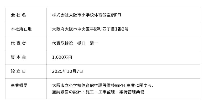 大阪ガス株式会社(社長:藤原正隆、本社:大阪市中央区)の100%子会社のDaigasエナジー株式会社(社長:福谷博善、本社:大阪市中央区、以下「Daigasエナジー」)は、2025年10月にDaigasエナジー90%出資の特別目的会社である株式会社大阪市小学校体育館空調PFI(以下「OCAP」)を設立し、2025年12月11日に大阪市とOCAPとの間で「大阪市立小学校体育館空調設備整備事業」(以下「本事業」)に関する事業契約の本契約を締結し、本事業を開始しましたのでお知らせします。