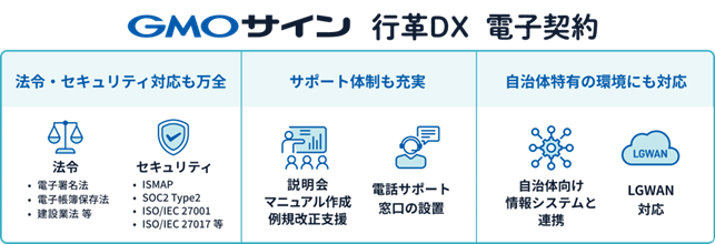 「GMOサイン行革DX電子契約」は、契約の締結から管理までをワンストップで行えるクラウド型の電子契約を、官庁・地方公共団体向けに提供するサービスです。庁内と契約相手方の事業者の双方において、契約締結にかかる印刷・製本・送付・来庁対応等の時間やコストを大幅に削減することが可能となります。