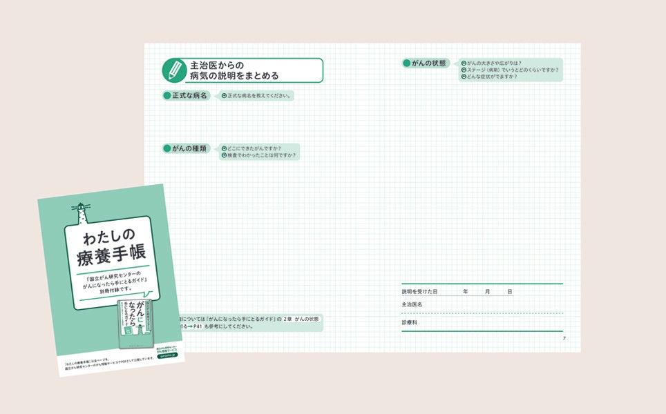 ・主治医からの説明や、主治医に聞きたいこと、自分が大切にしていること、体調変化の記録などを書き込みできる別冊付録「わたしの療養手帳」が付いています。