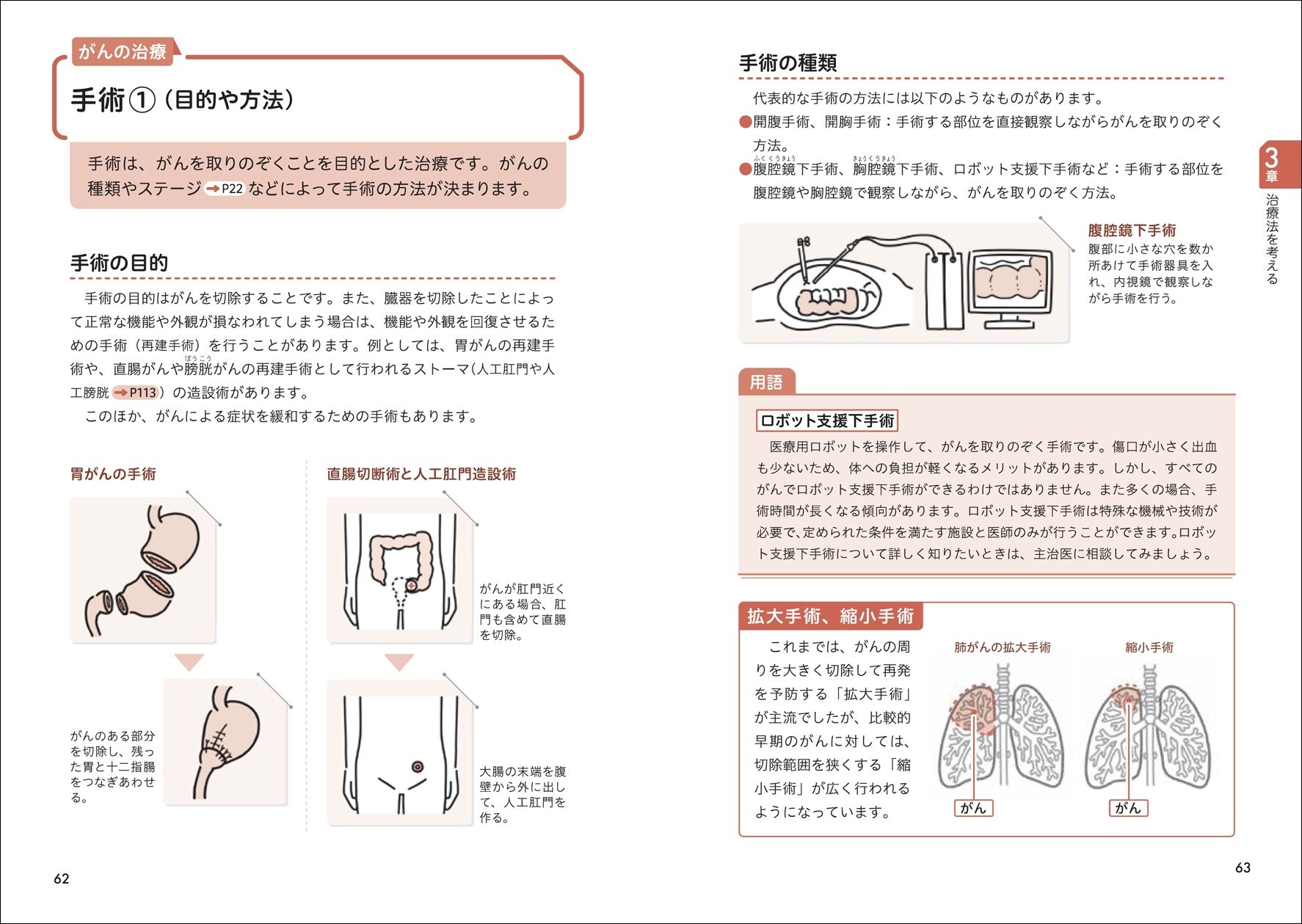 本書は、がん診断後に必要となる情報を網羅した一冊です。がん診断からがんの検査、治療法の正しい情報などを、わかりやすいイラスト図解を用いて、必要なときに探しやすいような章にわけて、丁寧にまとめてあります。