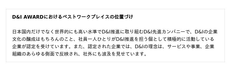 D&I AWARDでは「ジェンダー」「LGBTQ+」「障害」「多文化共生」「育児・介護」の5つの要素に分けられた100項目の設問回答をダイバーシティスコアとして採点、企業のD&Iの取り組みを見える化し評価します。採点スコアにより4つのレベル(ビギナー/スタンダード/アドバンス/ベストワークプレイス)に認定されます。TMJは昨年度、初参画で「アドバンス」に認定されましたが、今年度は取り組みがさらに評価され、最上位の「ベストワークプレイス」に認定されました。