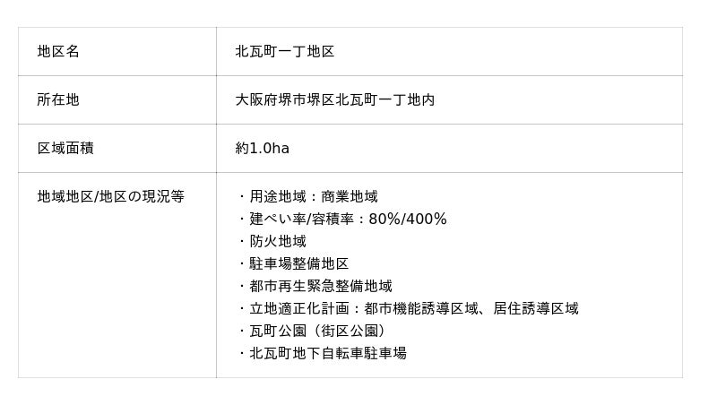 東急不動産株式会社(所在地:東京都渋谷区 代表取締役社長:星野 浩明、以下、「東急不動産」)を代表とする三菱地所レジデンス株式会社(所在地:東京都千代田区 代表取締役 社長執行役員:宮島 正治)、関電不動産開発株式会社(所在地:大阪府大阪市 代表取締役社長:福本 恵美)の共同企業体(以下、「東急不動産ら」)は、2024年7月に堺市が策定した「堺東エリアの市街地整備に向けた基本的な考え方」に定められている3つの先行的に取り組むゾーンのひとつである瓦町公園周辺ゾーンにおいて、市街地再開発事業を検討する北瓦町一丁地区市街地再開発準備組合(所在地:大阪府堺市、理事長:榎本弘一、以下「準備組合」)が募集する事業協力者に選定されましたのでお知らせします。