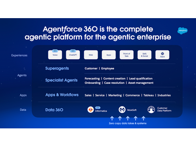 Informatica、Data 360、MuleSoft、およびAgentforce 360 Platformは、本日より利用可能です。これらの製品を組み合わせて導入することで、顧客は既存のエンタープライズシステム全体で信頼性の高いコンテキストを即座に獲得し始めることが可能です。価格はエディションおよび使用量により異なります。詳細は、Salesforceの営業担当までお問い合わせください。