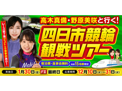 合同会社DMM.com(本社:東京都港区、PFカンパニーCEO:村中悠介、以下DMM )が提供する競輪投票サイト「DMM競輪」は、1月のイベント情報として高木真備&野原美咲 元選手と一緒に観戦できる「四日市競輪現地観戦イベント」の実施をお知らせいたします。
