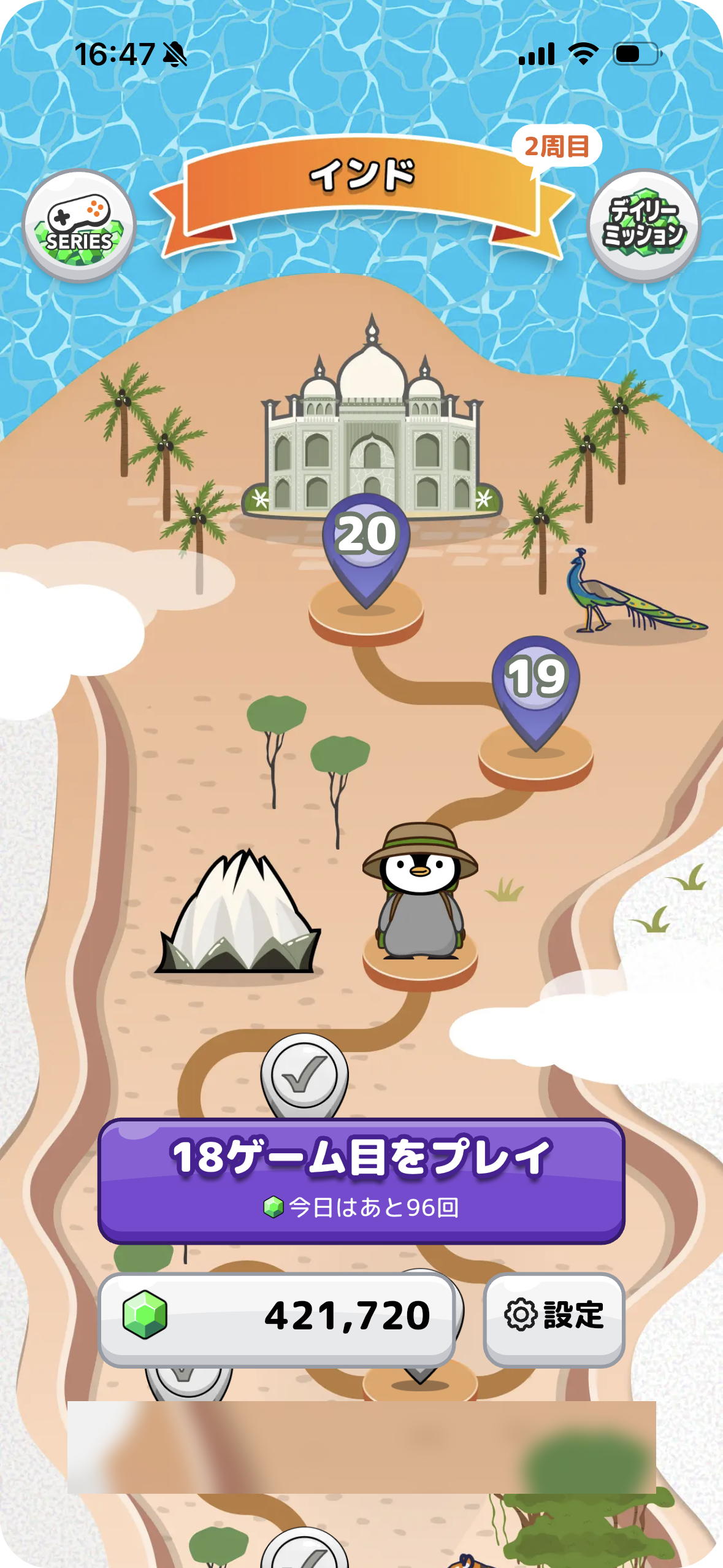 「世界旅行」をテーマにした10エリアをご用意しました。1エリアにつき10ゲームを収録し、エリア内の全ゲームをクリアすると次のエリアへ移動できます。各ステージをクリアしていくたびに、世界を巡るような達成感が味わえます。全エリアをクリアすると世界一周達成となり、2周目をスタートできます。