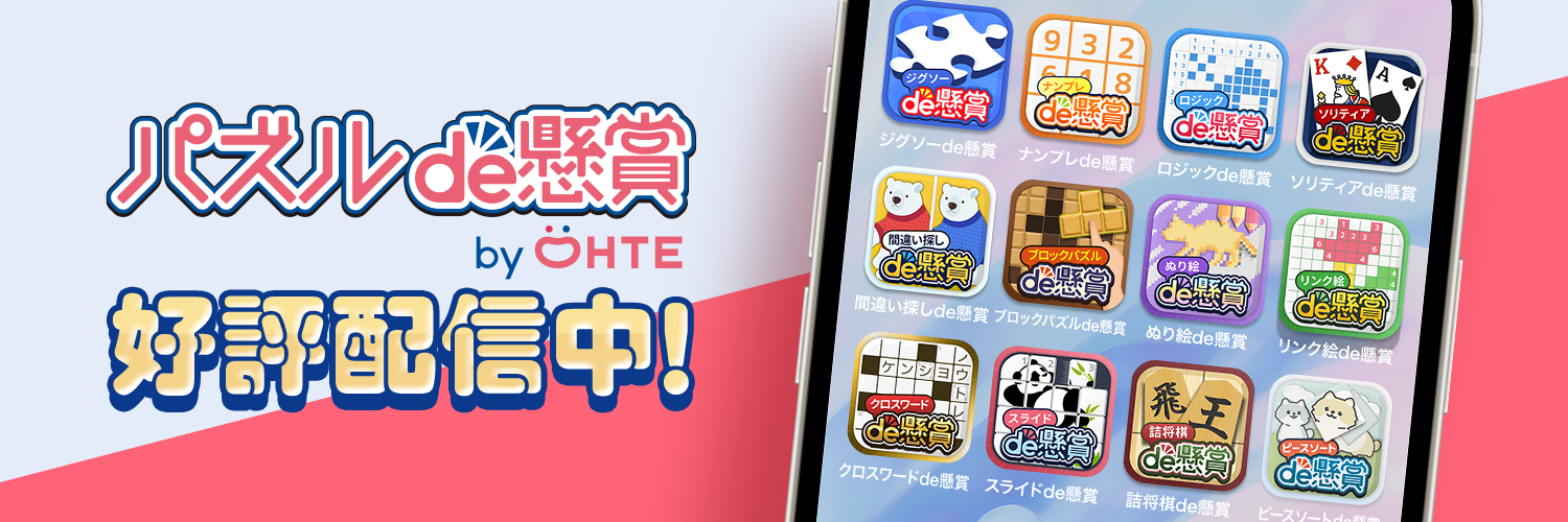 ・アプリのラインアップ:ジグソーde懸賞、ナンプレde懸賞、ロジックde懸賞、クロスワードde懸賞、ぬり絵de懸賞、リンク絵de懸賞、スライドde懸賞(※スライドde懸賞はAndroid版のみ)、ソリティアde懸賞、間違い探しde懸賞、ブロックパズルde懸賞、詰将棋de懸賞、ピースソートde懸賞、リバーシde懸賞、タイルde懸賞