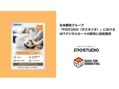SUSHI TOP MARKETING株式会社(本社:東京都千代田区、代表取締役:徳永 大輔、以下「当社」))は、日本郵政グループが運営する「POSTUDIO(ポスタジオ)」で配布されるデジタルカードのNFT配布に技術提供いたしました。